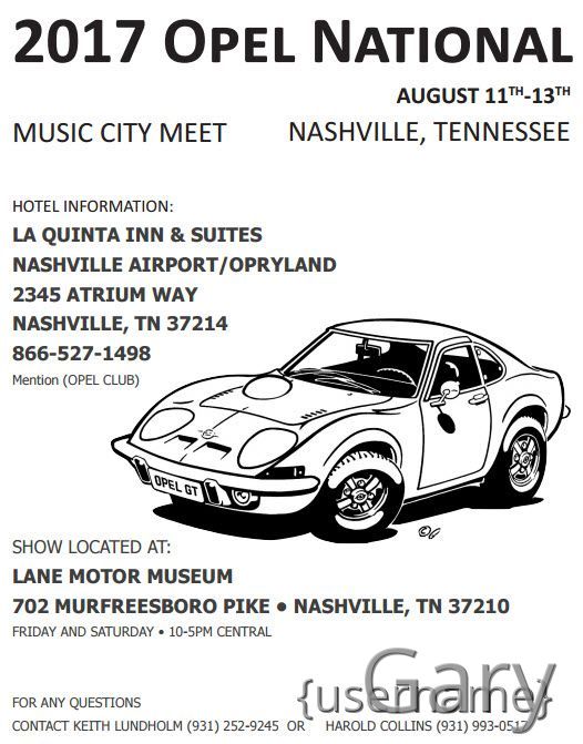 The 2017 Opel National Meet will be held in Nashville, TN August 11-12th 2017. This will be held at